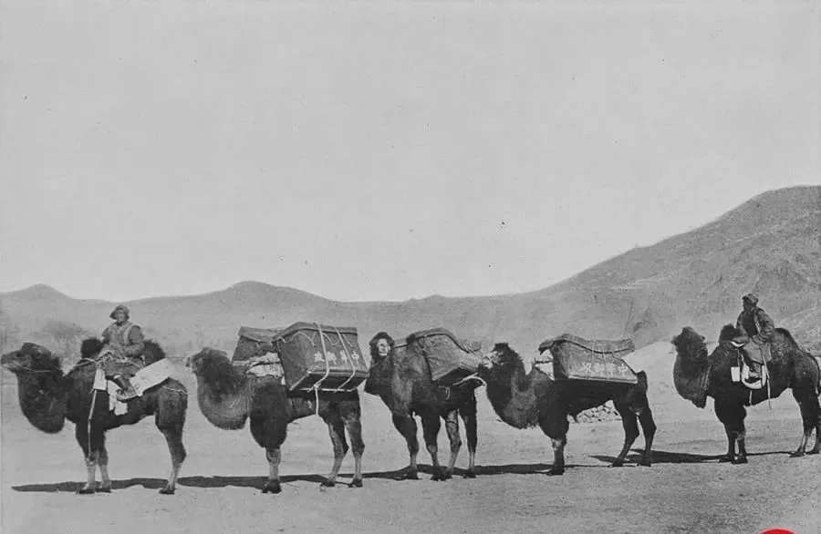 这个队列叫运信驼队,单峰骆驼一只接一只,驮箱外花布绳勒得紧,铃铛吊在鞍前叮当慢响,驼工披毡子眯眼望前,脚印一串在硬沙上连着,我喜欢看他们拐弯,队头一偏,后面的跟着拎步,山风把毛吹成一层一层的浪,那条路老辈儿叫张库大道,明里清里都走,慢是慢,稳当是稳当。