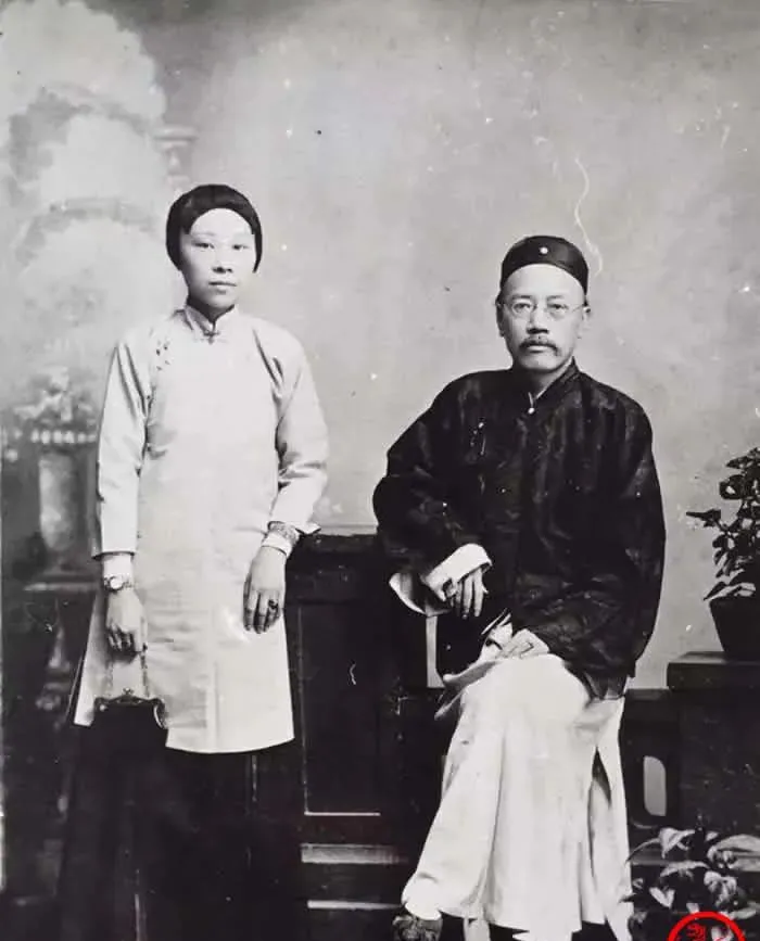 这对坐立的身影叫影棚合影,男的着长衫马褂,帽沿压得正,女的旗装素雅,手上镯子在灯下发亮,桌屏虚景画得密密,严先生科举四碰墙,好在转身去译书办学,外甥女站在旁边神情刚毅,家里老人讲起她时会压低声音,说这姑娘想法新,句子利落,过日子不肯按旧样来。
