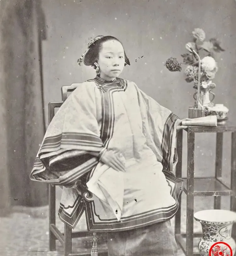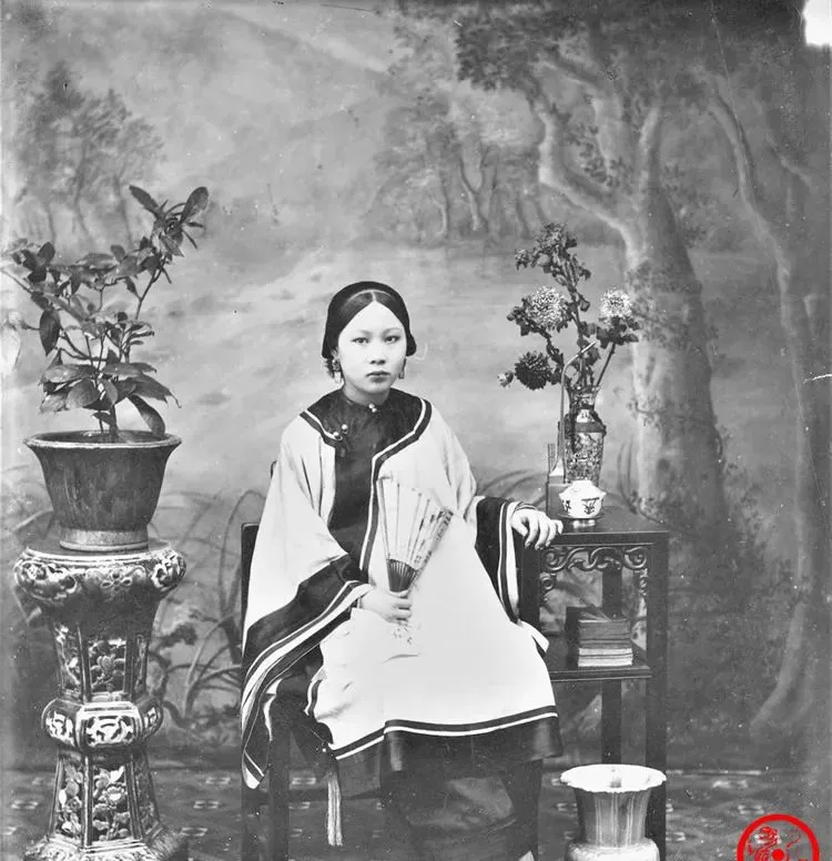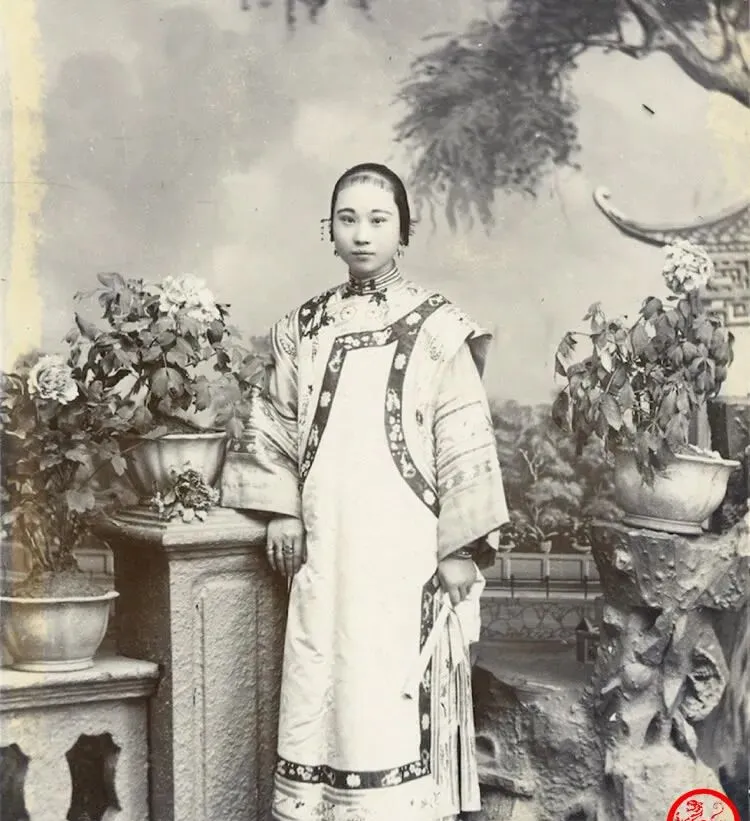 图中这位女子叫贵家小姐也不为过,她披着宽袍大袖的织锦袄,边上滚着亮色镶边,耳垂坠子坠得温温顺顺,手里把着折扇,桌上摆花瓶与青花盖碗,一看就是照相馆里搭的园林景,讲究得很,奶奶看见这张就说,老辈人拍照都端着身段,腰板挺直一点都不能塌,可见那会儿有规矩才显体面。