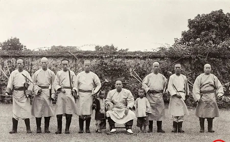 这排挎弓配刀的叫弓手营,腰间绳套挂着箭袋,弓背亮得像抹了油,站在正中的老爷子稳稳坐着,小孩儿在腿边听训,叔叔说他们还要考骑射,跑马射柳一套全来,不过到了晚清,枪炮说了算,弓箭留下的多半是门面与体面。