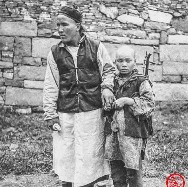 图中拉着孩子的叫盲艺人,左手拄着竹杖,右手牵着小手,孩子背上横着一把二胡,小铜碗系在腰间叮当响,路上若有人停住,他们就站定一段腔,唱到高处嗓子一飘,风把尾音吹散了,姥爷说旧时候没有什么救济,唱得好不好,能不能吃饱,就看这一路的缘分。