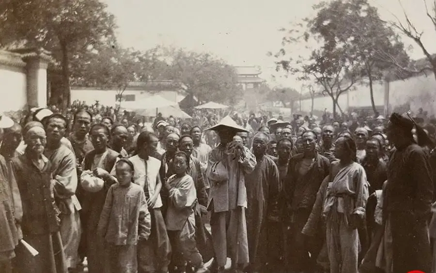 图里这片人海叫围观,真就两个字,密,挤,男的女的老的小的都探着身子看,前排有位戴着斗笠的,大袖一拢,像是领着乡里人来凑个热闹,衣裳多是粗布麻料,颜色发灰发褐,袖口被磨得起毛,脸上全是好奇,这一回可见了从没见过的洋面孔,小时候我在集市看戏也是这阵势,先听锣鼓近了,再被人群一点点推到前头,脚下生风一样热闹。