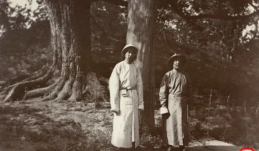 这个场景叫留影,树根粗得像缠在地里的龙,两个穿长衫的人站得端正,腰间一只小荷包挎着,帽子是硬檐的洋式凉帽,阳光一打,布料的褶子清清楚楚,老辈人讲,拍照在那会儿是件大事,得站稳了别眨眼,别看现在人人会摆造型,那时候一张照片要走好几步手续才能拿到手。