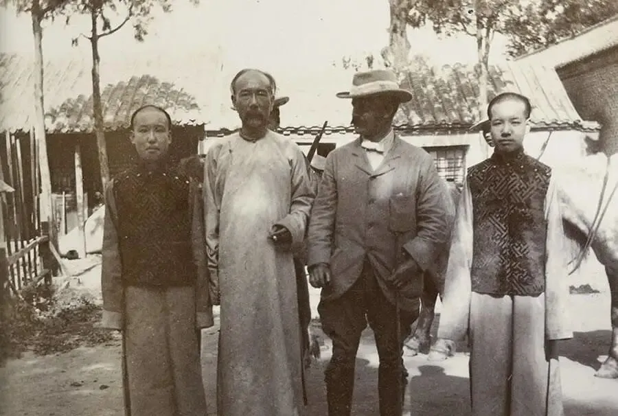图中这位穿洋服的外宾旁边,留着山羊胡的就是道台大人,两侧的小少年穿着坎肩马褂,发髻束得光亮,站姿学得有模有样,眼神却还带点稚气,妈妈看了这张图就笑,说以前当官讲体面,孩子跟着出来见世面,回家还得把见到的礼数一条条学会,现在孩子上台领个奖都要怼着镜头比耶,时代真换了个劲头。