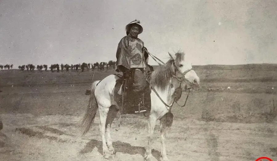 这匹小白马配的是简装马鞍,鞍前搭一截毡子,人身上罩了件粗布披风,绊带勒在脚面,马口上吐着白沫,像是走了一段长路,风从荒地刮过来,帽檐被吹得歪一点,他往前眯眼看,像在找队伍的影子,小时候看电影里的差役出场也是这身架势,鞭子一甩,扬起半截土烟。