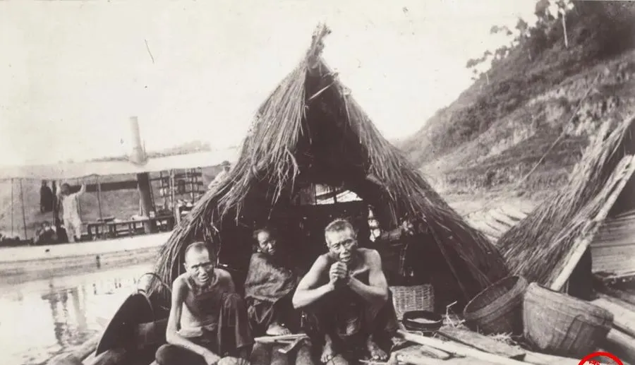 图中这顶草席棚搭在船头上,住在里面的人叫疍民,船就是家,篷就是门和墙,篷外一圈圆口竹篮,是打渔装网的家什,男人瘦得见骨,脸上都是风晒的黑亮油光,岸上蒸汽船的烟囱杵着,像另一种生活在旁边晃眼,老人蹲着抽旱烟,手指夹着短杆,烟雾一吐,水面上飘起一层薄气,穷是穷,日子还是要过,撒网、收网、烫饭、洗锅,全在这几步地里转。