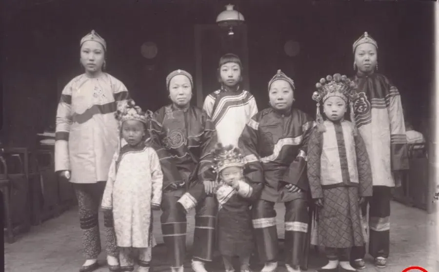 这个穿纹样长衫的一家子在照相铺留影,头饰压得小丫头眉毛都竖起来了,细看她们脚下,都是没裹的小脚,这在当时算是稀罕的幸运,摄影师让大家别眨眼,咔嚓一声定住了,一个时代的衣料花纹和体面,全系在这张纸上了。