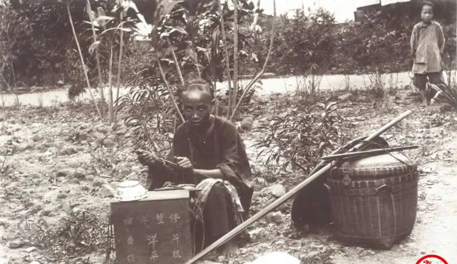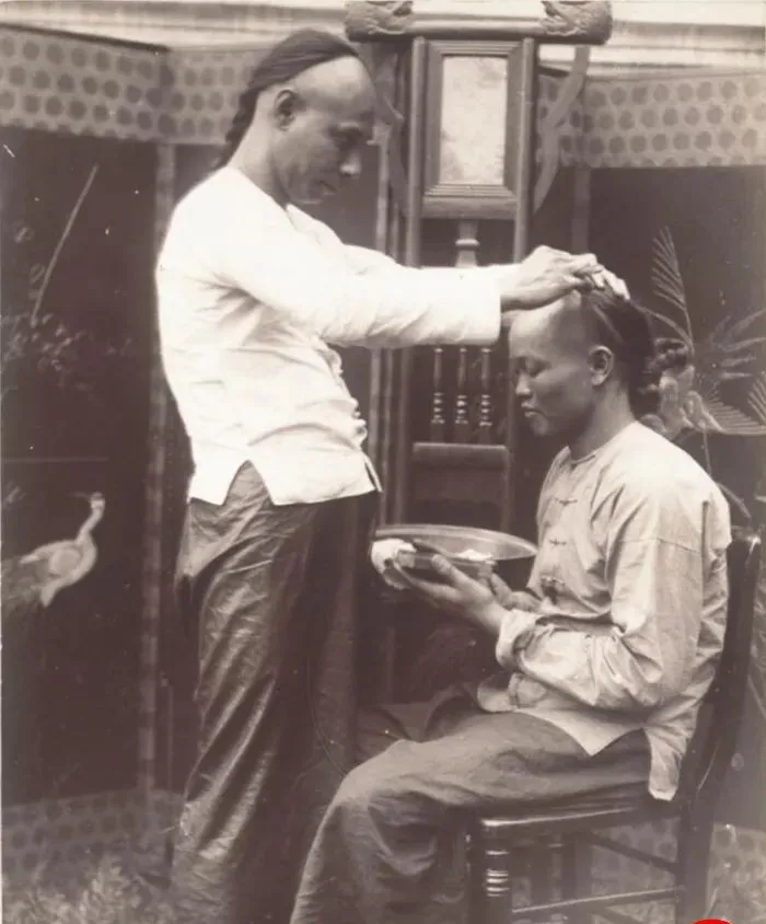 这个手里拿刀的就是剃头匠,顾客自己端着盆接碎发,姿势别扭得很,刀口在前额推过去时,青皮顺着光线发亮,后面那条辫子还规规矩矩搭在背上,师傅嘴里叼着纸烟,含糊一句,下回十天再来,要不就乱茬了,现在电推子嗡一声几分钟搞定,那时候靠的全是手上匀劲儿。
