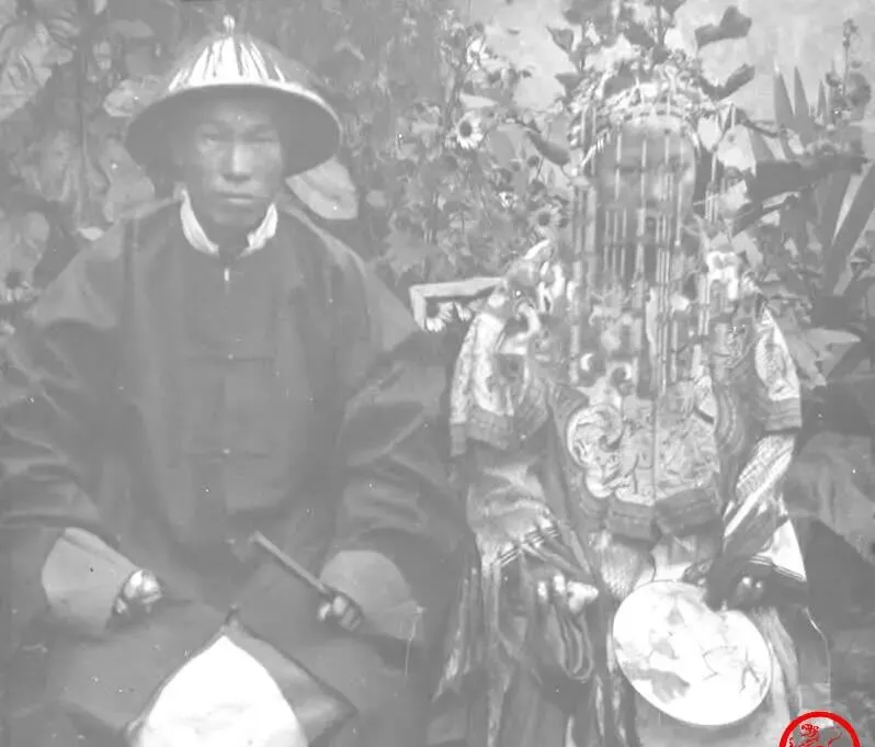 这个场景叫新婚合影,男人穿的是清式夏袍,圆领对襟,袖口宽宽,女人一身红装礼服,额头压着珠翠的凤冠,脸几乎被遮住了,只露下巴的线条,手里还托着团扇,背景摆着花木,显得热闹体面,照片上的僵硬坐姿不是装架子,主要是那会儿拍照要端着不动,稍一晃就糊了。