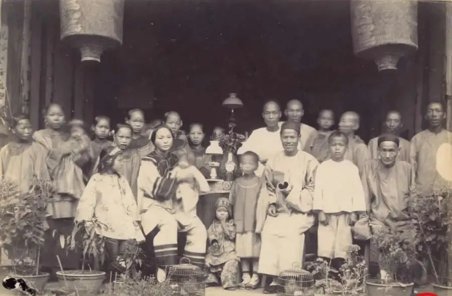 这个大阵仗叫全家福,门梁下挂着两只大红灯笼,几张太师椅排成一溜,前头放着座钟和煤油灯,鸟笼子挨着摆开,孩童站在脚边抻着新衣下摆,老人把旱烟杆横着搁在膝上,主人家显然有些底子,拍照前还把院里的盆景端了个遍,妈妈看了笑,说你看这讲究劲儿,摆得比年夜饭还齐呢,现在拍合影谁还搬家伙事儿,手机一举就完事了。