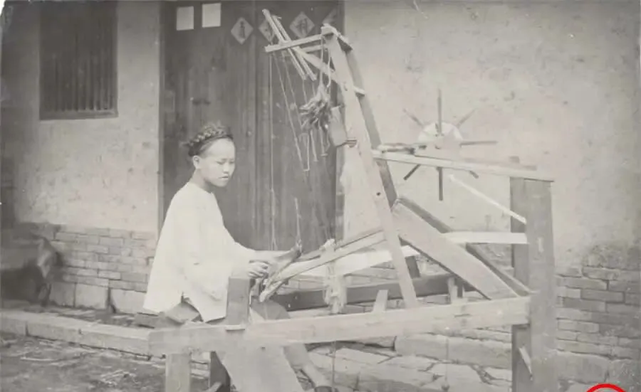 这个木架子叫织布机,横梁竖柱全是软硬不一的老榆木,脚下踩板吱呀作响,梭子在经纬之间穿来穿去,少年模样的男人坐得端正,手腕一翻就把线抛过去,神情专注得很,传统里织布多由女人来做,这张照片里男丁上机,算是罕见,外婆回忆小时候家里纺车一响就像雨点落瓦,织好一匹布得晾两天,摸上去带点浆的挺括味道,现在买衣服一件件袋子撕开就穿,手里的布味道却淡了。