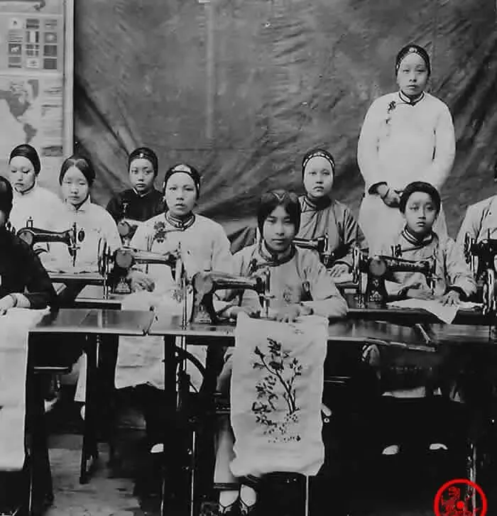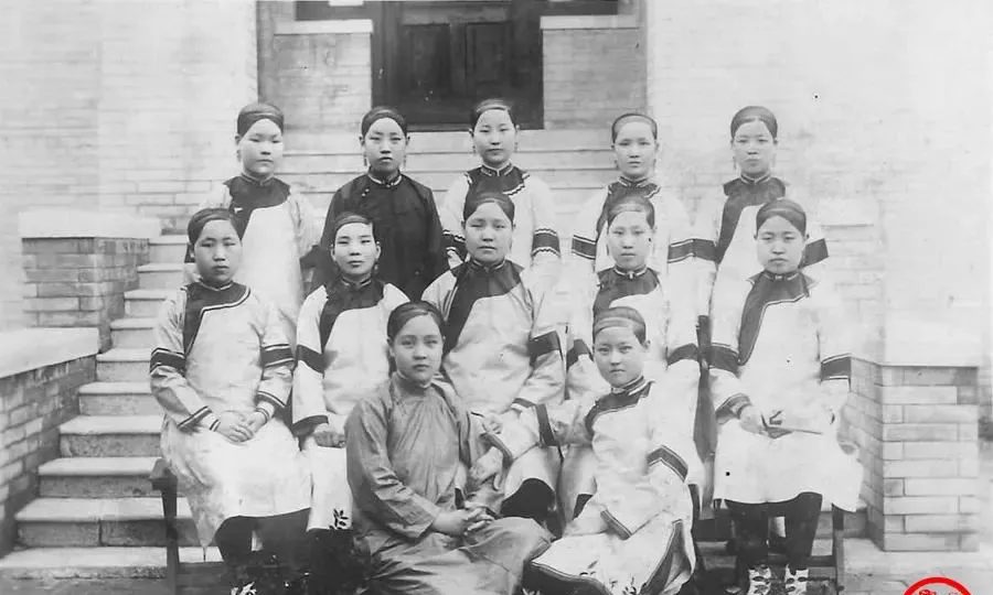 这个“坐像”其实就是毕业照,前排两把靠椅,中间空出一条过道,好让镜头把后排也收齐,头发一律抿顺,额前压着细细的发带,脚上布鞋绣着暗纹,最左那位衣摆边角露了针脚,手上怕是刚练完女工,缝线还没收好,别看衣色素净,心气可不低,书房一日不关门,窗纸就要被她们的志气顶开一个角。