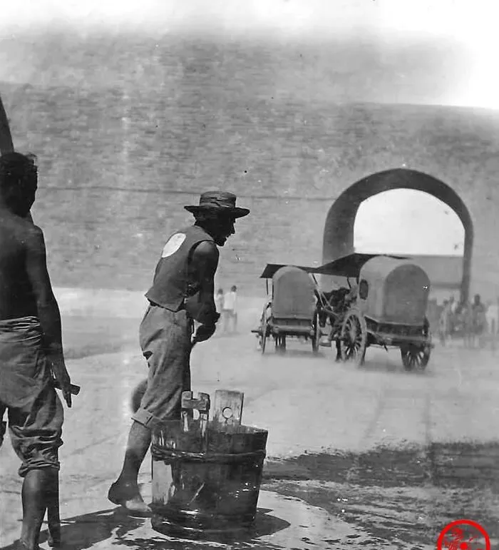 这个活儿叫泼街,木勺粗把儿,桶是双耳大木桶,水装八分满才好抡,俩人一组,一个抬桶一个持勺,讲究是走三步泼一勺,既要泼得远更要泼得匀,老北京土道儿尘大,先铺黄土再净水压一遍,才不至于轱辘一碾全是灰,爷爷说那会儿碰上大风天,晾的被单出门就得重洗一回。