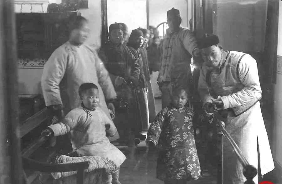 这张里最抢眼的是三把大刀,刀背厚实,刀柄缠绳,靠着椅子成“一”字摆开,旁边是漆木小几和绣花靠枕,屋里还立着带花枝的壁龛,旗人讲究尚武传家,孩子靠在桌沿打盹儿也不怕,家里人自信得很,这几样摆设就是镇屋的气口。