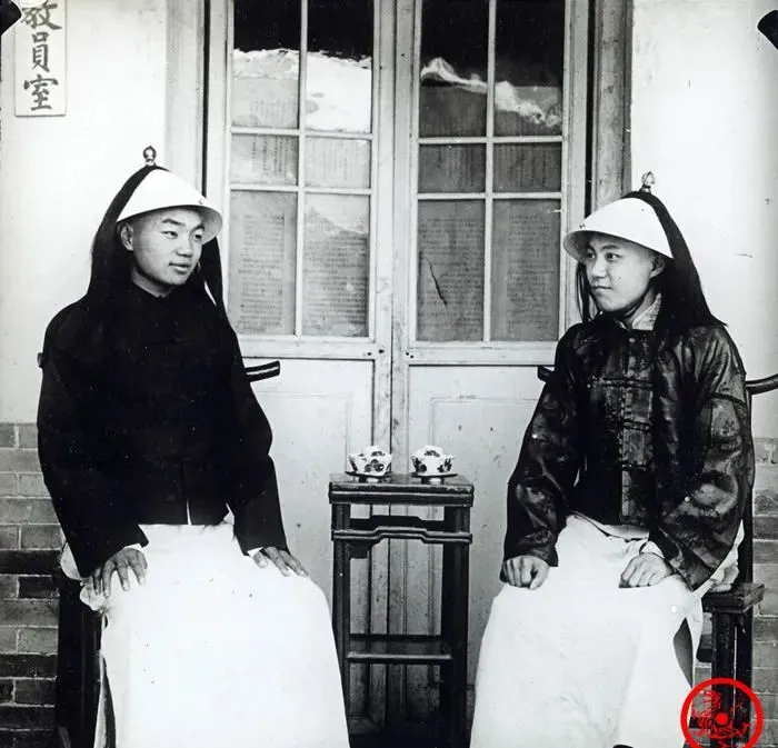 图中新娘新郎坐定,长衫马褂压得笔挺,白色礼帽边沿微翘,面前一张小杌子搁了两盏盖碗茶,门扇是木格嵌玻璃的样式,旧气里带着点新潮的冒头,奶奶看这张就笑,说以前拜堂讲究多,吉时一到,长辈喊一声起身,合卺酒一碰,锣鼓一响,屋里屋外都热闹,一盏茶也得按辈分喝完才好散席,现在婚礼倒是轻省了,流程全交给主持人,照片随手一拍能有几百张,可这份慢吞吞的端详味道,再也不多见了。