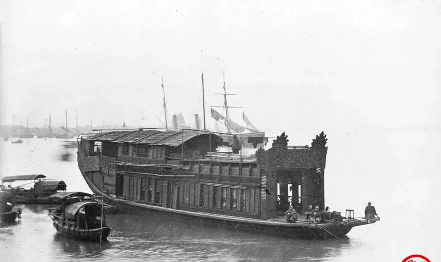 这个大腹便便的船叫花船,木篷层层往后接,舷侧开了长条窗,一水儿细格子,收拢起来就是一面亮亮的墙,江风顺着窗缝钻进去,人声笑语飘出来,听着像隔了一层薄纱,外公讲过珠江口的夜色,灯火挨着水面走,千门万户在水上开张,船家手里一支竹篙,轻轻一点,整条船就像猫一样挪动。