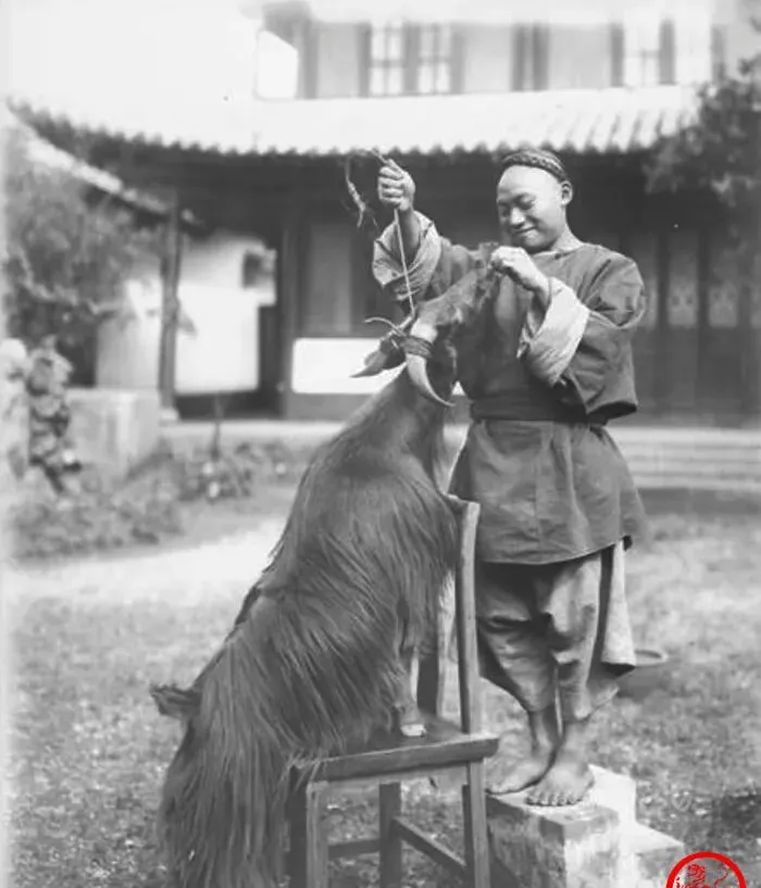 这个长毛的家伙是山羊,毛从脊背垂到腿边,顺得像瀑布,男主人笑眯眯把角提着,羊前蹄立在椅子上,像台上做节目,小的时候我们看社火,最盼杂耍上来,鞭子一甩,羊走梅花桩,孩子们跟着数,一二三,差点没把嗓子喊哑,现在动物表演少了,讲保护,挺好,回忆留在心里就行。