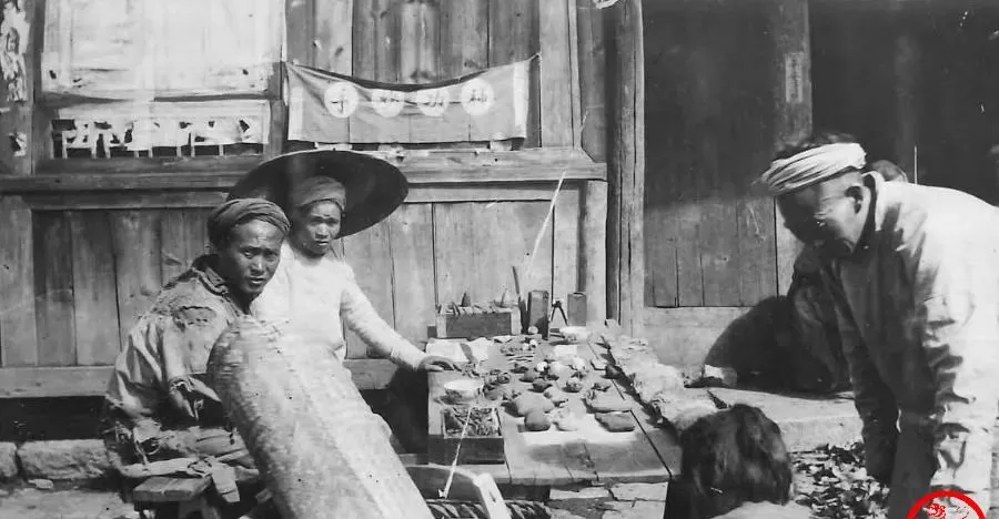 这张里两位坐在木板前的家伙,一个是江湖郎中,一个是卖药的贩子,桌上摆着砚台大小的药块和小纸包,后面挂着写着“神功妙手”的旗子,烟袋锅子搁在一旁,爷爷说他年轻时见过类似的摊,诊脉时手背朝下,指尖轻轻搭着,嘴里念叨几句,然后写个小方子,旁边小贩“唰”地把药抓好,纸一抖绑根线就递过来,那时候没有处方笺扫码付钱,都是讲价讲到彼此都不气了再成交。