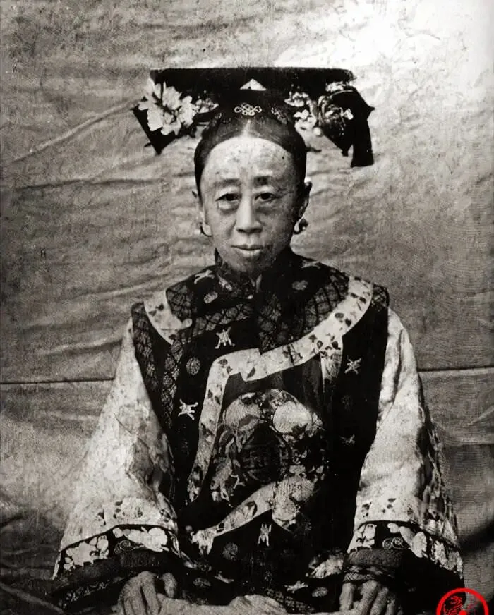 脸上那股子清冷劲儿,配着沉重的朝冠和大团寿字补子,布料厚硬,颜色发暗,袖口滚着团花,坐姿正得跟标尺一样,她不爱打扮是出了名的,亲友说她**“衣履朴素,不事脂粉”**,寡居后更甚,才二十来岁,人却像熬成了老相。