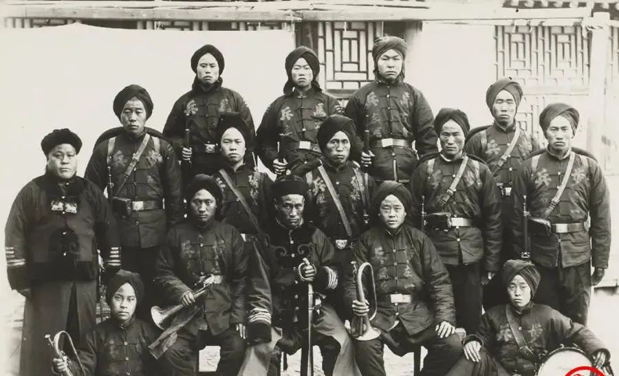 这群人是清军合影,有步兵有马兵,前排还抱着号角与大鼓,棉甲外面缝着几个大字,腰间挂刀,眼神却有点飘,像是被硬拉来拍照,小时候看古装戏老以为军队都是金盔金甲,真照面才知道多半是粗布棉袄,冷天站岗全靠它扛风,现在部队讲合成与协同,彼时还在琢磨洋枪洋炮怎么上手,路还长着呢。