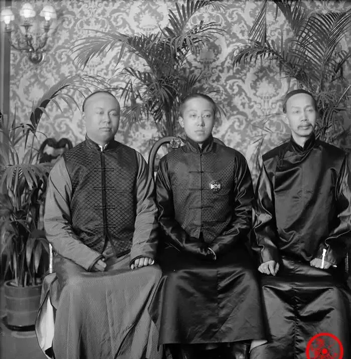 这张是在照相馆的布景前坐着的三位绅士,中间那位是皇族,黑缎马甲反光,胸口别了小徽章,靠背椅子腿雕着卷草纹,后面的盆栽高过肩,摆拍的味道挺重,像是刚学会“出洋相”的新姿势,爸爸指着说,看,人家也在学新东西,去考察,去看军校,动作是有的,奈何天时不等人。