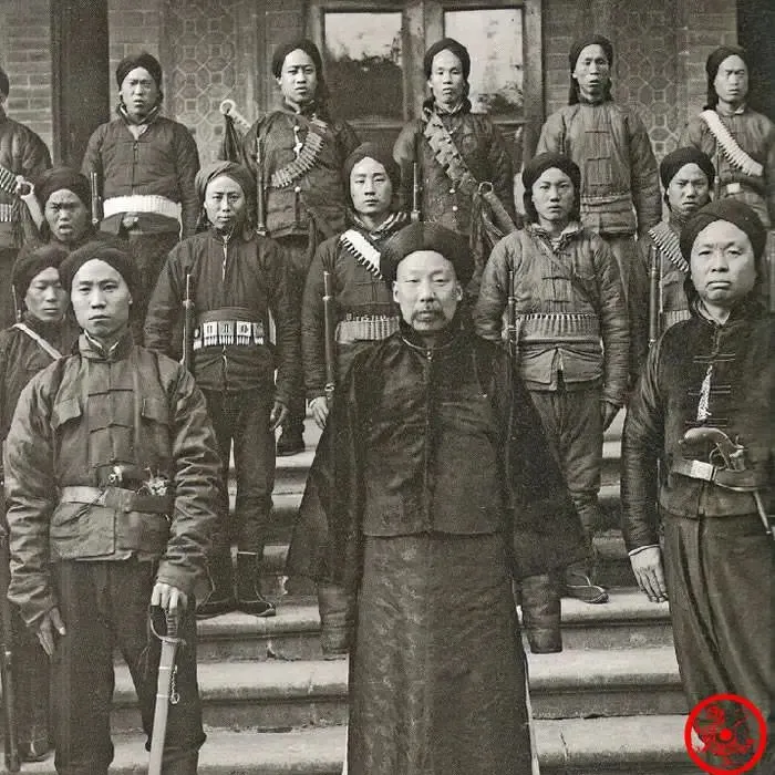 图中这位穿长袍的主官叫正二品总兵,黑缎面马褂压得住台,胸口无章却有气场,身后那一溜儿兵丁,棉甲往外鼓,子弹带斜挂在胸前,长枪立在脚边,站在台阶上层层压住,旧军队里最讲究的就是队形和眼神,别看戏里老打花架子,真到营门口,规矩可比戏台子硬多了。