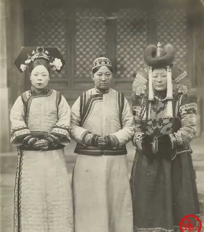 这个队形一站,左一满族头饰高挑,繁花压得住额角,左二剪裁干净,袖缘滚了两道细边,右三那顶蒙古大套帽像一弯厚月,垂穗从鬓边垂到胸前,皮草滚边把肩膀撑出一个弧,手上都带套袖,不露指甲,妈妈看完只说一句,女人的体面不靠腰身,靠气象,那时候的礼装,走两步都得掂量着脚面。