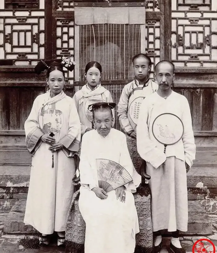 这个老爷子坐在中间,手里折扇扇骨密密的,背后是格扇门,孩子们站两侧,手持团扇画着山水花鸟,衣襟上钉着小扣子,排得像麻籽一样齐,妈妈看见这张笑了,说一家人能拍到整整齐齐的一张,衣不华贵也体面,以前照相像过年,现在手机一翻都是脸。