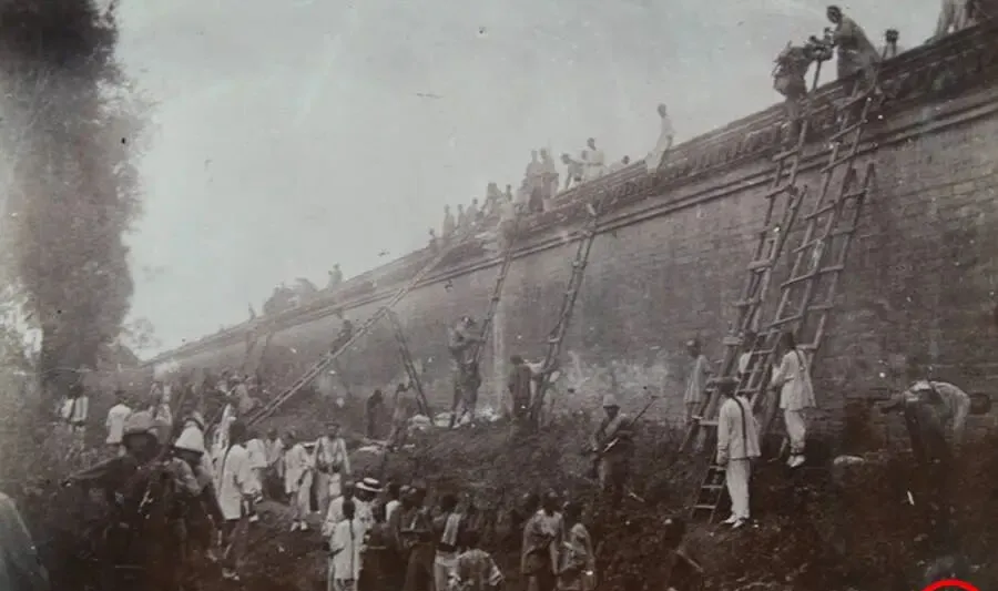这里梯子扎得急,长短不一,靠在女墙下边,人从上到下像蚂蚁搬家一样移动,地面上有人抬着东西,还有几个打着赤脚的在看热闹,远处冒着烟,镜头糊了点,但劲儿在,爸爸叹口气,说墙再高,也怕从里面松掉那口气,现在城楼成了打卡地,谁还想起当年的惊慌。