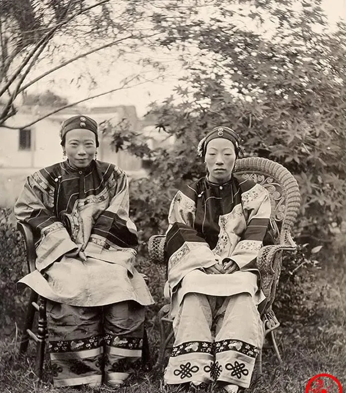 这两位穿的是袄裤加抹额的官眷打扮,衣襟滚边,鞋面绣花,裤脚肥大,绣线密到发亮,坐椅一个藤的一个木的,姿势很端,脚尖并着,小脚若隐若现,外头看着体面,里头不知疼了多少年,妈妈看了只叹一句,漂亮要付代价,这话放到现在也还灵。