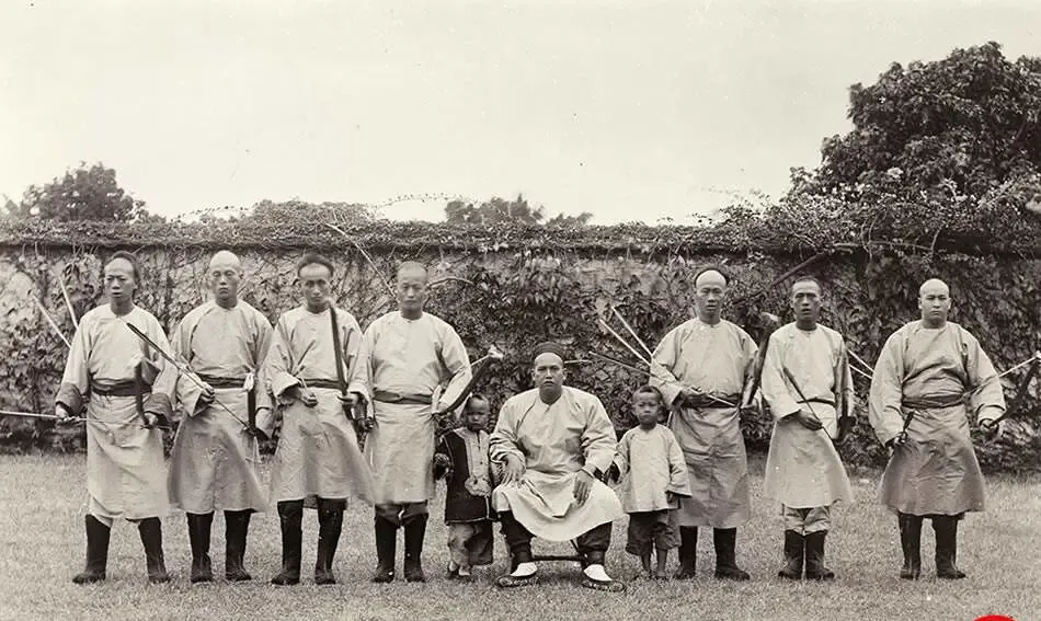 这一排叫弓兵练操,清军的长靴厚底到膝,腰间挎着箭袋,弓臂有的包皮有的直接露木纹,站在中间坐着的是头儿,神情不怒自威,旁边两个孩子扎在队伍缝里看热闹,场面不紧不慢,像是例行的校阅,爸爸说,冷兵器的规矩讲究肩肘腰的劲,一松就虚,现在射击场改成电子靶了,肩肘腰也还那三处,不过换了壳。