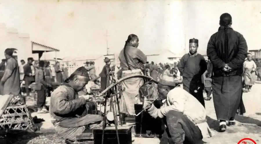 图中这片开阔地就是临时集市,人挤人,摊挨摊,铁匠叮当响,剃头挑子一摆就开工了,前景这几位围着小炉子鼓捣,风箱一拉一合,火星子冒得欢,旁边编筐的手不停,草蔑子在指尖上刷刷响,北京城的烟火气就这么堆出来的。