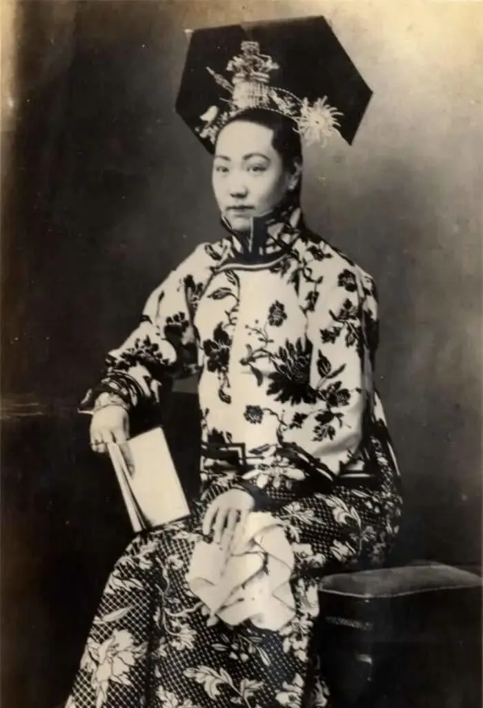 这个夸张的头饰叫大拉翅,丝绸旗装花纹密密,袖口滚边利落,手里还夹着一本书,坐姿端着却不僵,头冠横展一尺多,簪花点翠真够分量,奶奶说那会儿逢年过节走亲戚,先得把头上这家伙安稳了再敢出门,不然风一刮就成笑话了。