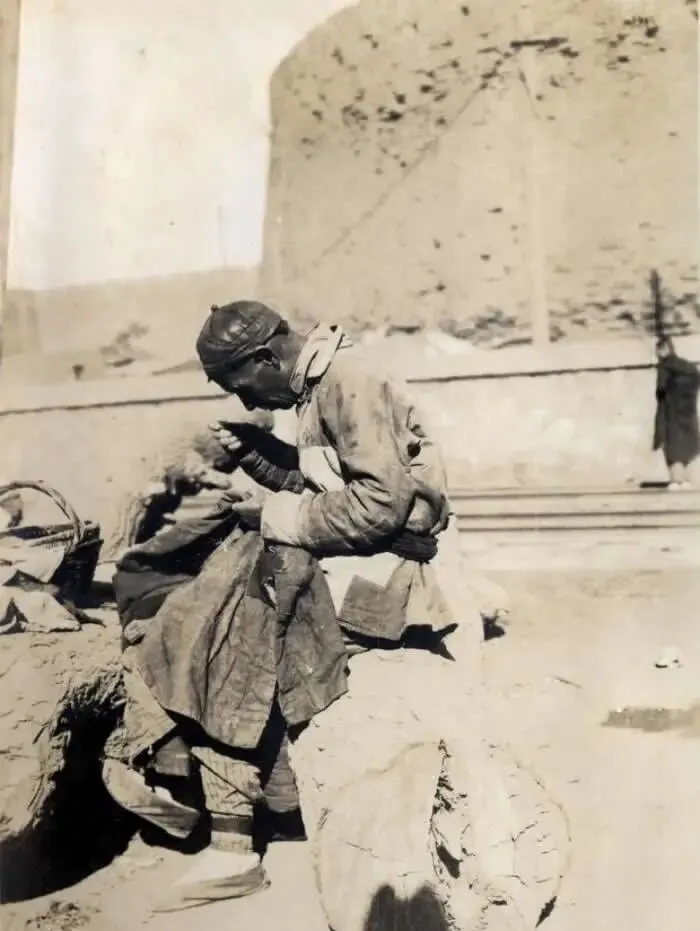 这个弓着背的手艺人叫缝补匠,破袍子往膝上一搭,粗针粗线一戳一拉,线结用牙一咬就紧了,工具篮里塞着顶针和蜡块,蜡线顺手一抹就顺溜,妈妈说以前谁舍得扔啊,补补又一冬,城墙根底下坐一上午,能攒回一兜碎银子就不错了。