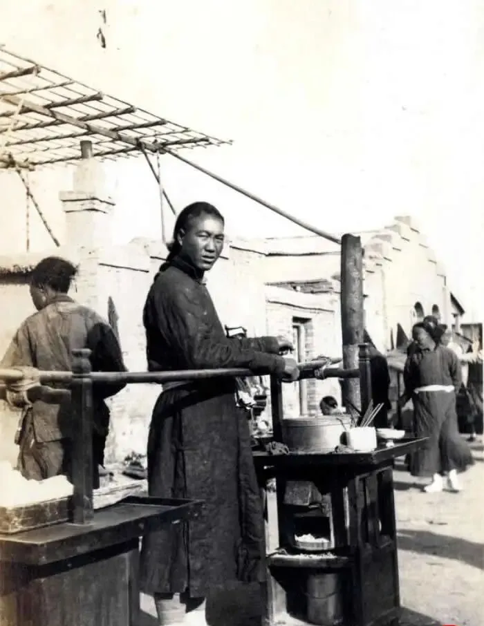 这个带炉子的担子就是流动小吃摊,一头是火炉一头是食材,铁锅咕嘟冒泡,蒸屉里白气直冲天,老板袖口挽到臂弯,筷子在锅里挑来挑去,手一快就捞出一碗,撒葱花泼酱油,咸香一飘,隔壁巷子的人脚底板都挪过来了,那个年代没外卖,一声吆喝就是外卖铃。