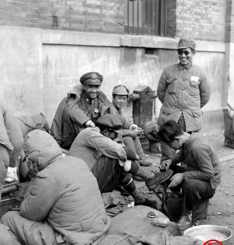 照片里的矮凳叫擦鞋墩,黑亮的鞋油罐子敞着口,一个兵把脚抬得高高的,另一群人笑着打岔,这会儿还能笑,说明鞋底还热,等再往南跑几站,笑声就不剩几句了,城墙根的风真刮人,笑完也就沉默了。