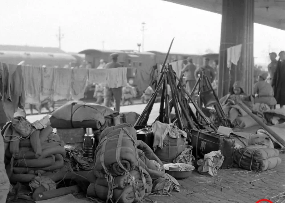 这个三角形的摆法叫立枪架,几束皮带把刺刀攏在一起,旁边一溜溜卷好的棉被,缝线外露,褪了色的铝饭盒压在包裹上,衣服吊在绳子上滴水,军站檐下阴冷得很,火没处生,只能靠身上的旧棉袄顶一顶。