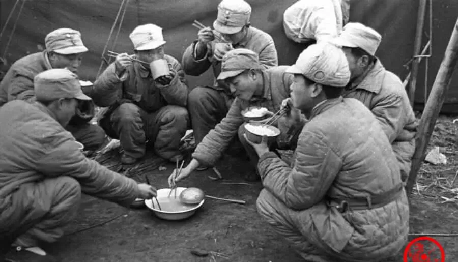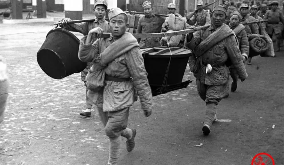 图中这口黑锅是连队灶锅,锅耳子粗得像拳头,前后两人扛着,肩上又压着铺盖和枪,脚下跑得飞快,队伍在后边喘成一片,厨子咬着牙说锅丢不得,这玩意儿能养命,没锅就没队伍,这话一点不夸张。