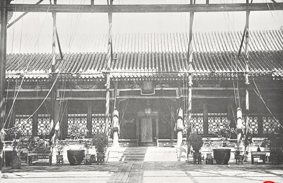 这个院子叫仪鸾殿,屋脊压得整齐,前檐下一溜儿海棠花格,檐口悬着大灯,院中竖着临时的木架,像给谁搭台面一样,太后冬天就在这儿养气,可照片里盆景靠墙,人影占了位置,后来失火一把,木作的梁枋受不得,烧得干脆,想起这段,真有点说不出来的堵。