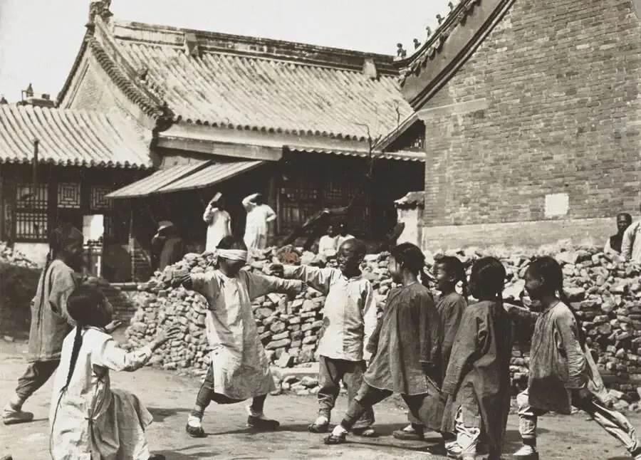 这个孩子们围成的圈叫摸瞎捉人,蒙眼的那位两手平伸,脚下踉跄,旁边的小家伙憋着笑挪步子,石墙边上有人拍手打节拍,谁被摸到得喊出名儿才算数,妈妈说她小时候也玩,布条一系,风一吹就闻到汗和土混在一起的味道,现在的孩子更熟悉电子音效,院子里的笑声却少了几分原味。