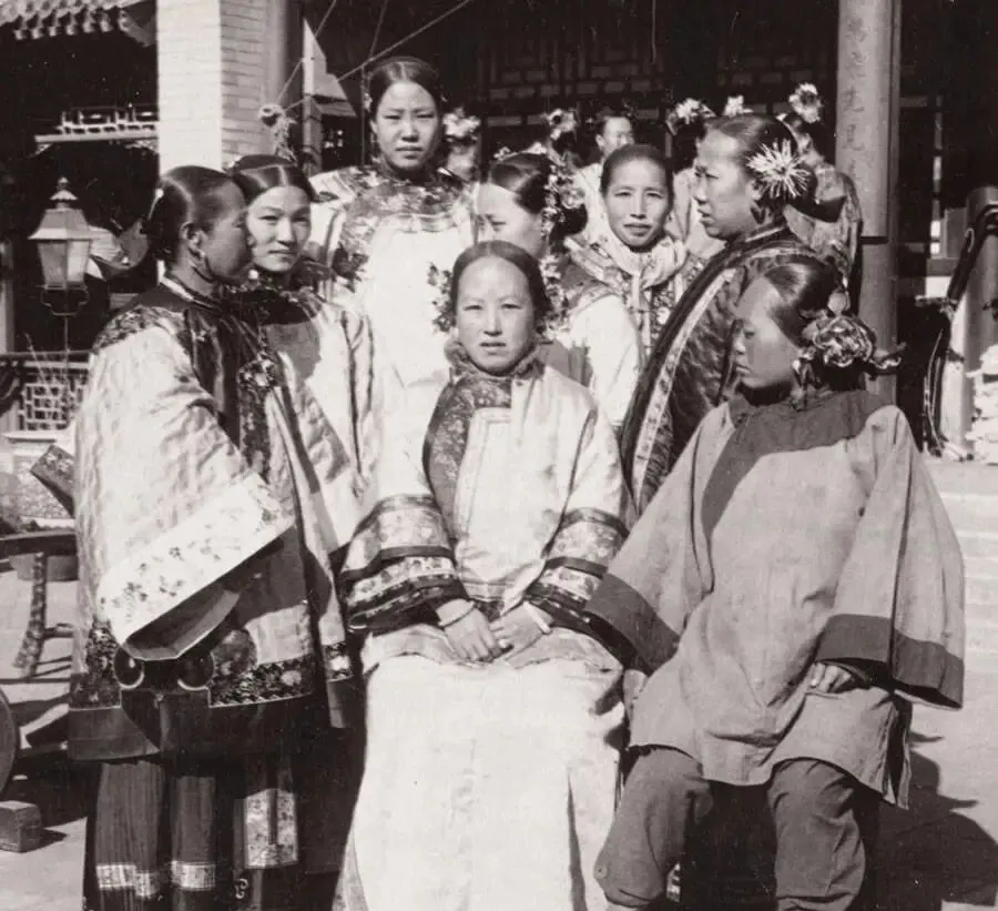 这群绣花窄袖与弓鞋并排的,叫内宅合影,正中那位坐得直,旗装上滚宽边,侧边两位裹小脚,步子挪得细碎,发髻上塞满花,笑也不敢太放开,院里柱子上挂灯笼,檐下纹样密密挤挤,妈妈看了说,衣裳再讲究,日子也未必好过,规矩多得叫人喘不过气来。