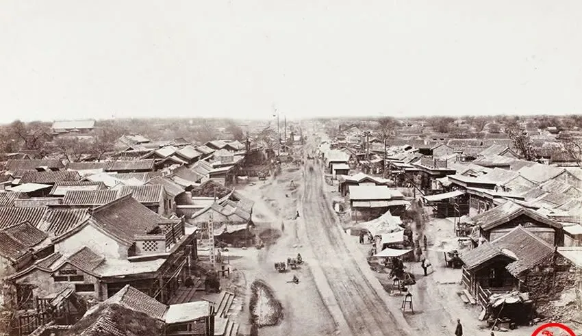 这张像是站高处往北一看,街道被马蹄车辙压出两条深槽,两旁店铺鳞次栉比,旗匾子硬挺着挂在檐下,屋瓦一色灰,远处人影稀稀拉拉像被风吹散的麻点。以前没有高楼,天就是天,云就是云,现在上去一看,玻璃墙能照出半个城,热闹是热闹了,旧味儿淡了。
