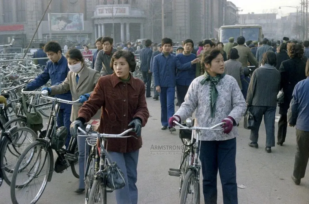 不知道他们是逛街,还是去看电影。大家有没有发现,前面这个短发女孩的车头上挂着一个皮包,皮包上面印着东方明珠,底下写着上海,应该是上海牌的皮包。以前家家户户的年轻人,都会挂这么一个包,或者是军挎包,出门用很方便。