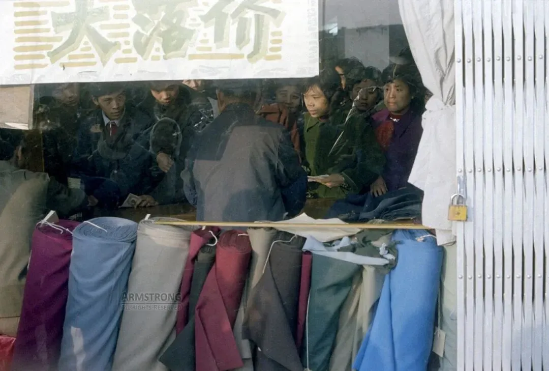一卷一卷、一匹一匹的布,都堆放在售货员的身后。那时候做衣服基本都是家里自己做,夏天会给家人做一身,过年的时候更是要赶紧买上喜欢的、流行的布料。有时候去晚了,好看的布就被抢没了,所以才会出现大家拥挤着抢购的场面,买回去给家人做新衣服。