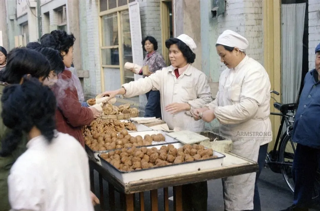 这个场景,应该是国营单位的餐馆,在外面摆摊卖油炸果子。虽然我不知道这张老照片是哪个城市的,但盘子里的油炸果子,跟我们山西大同这边的很像。