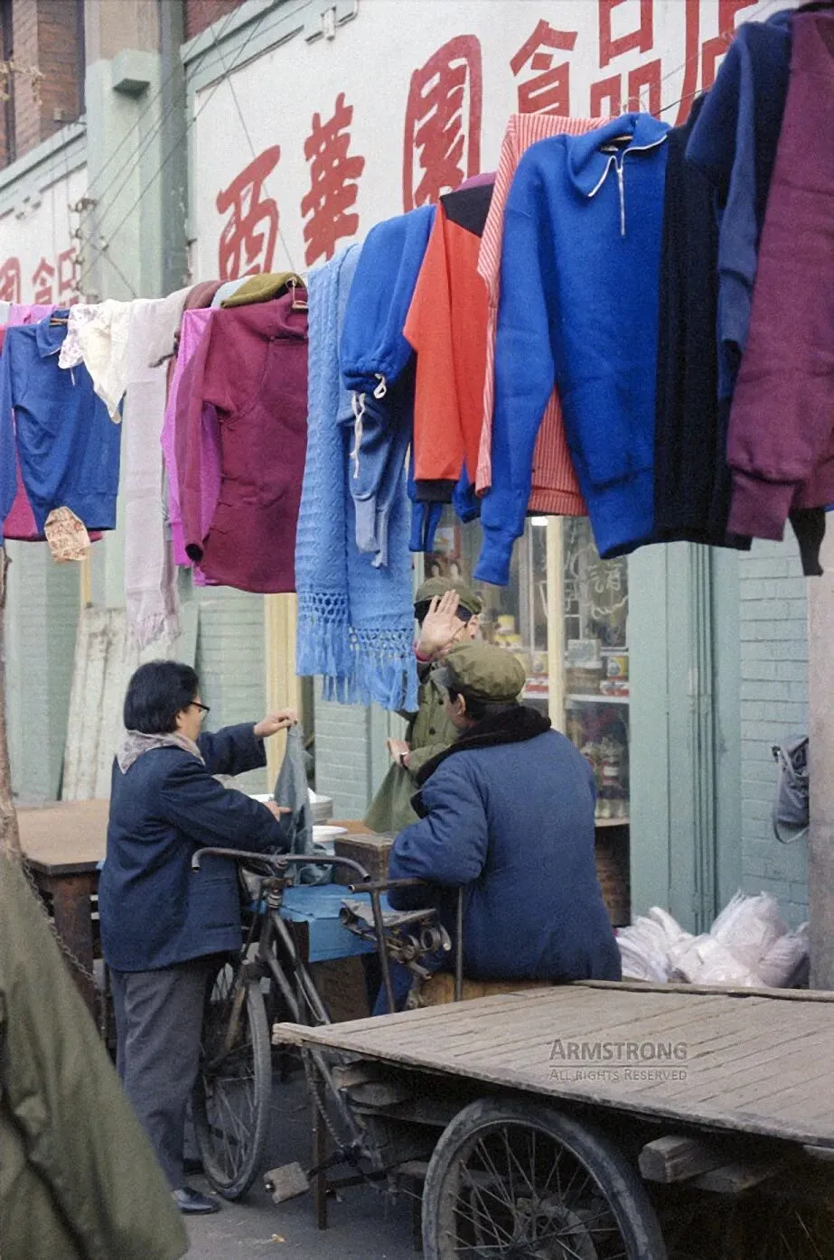尤其是快过年的时候,大集上格外热闹。大家都会去卖衣服的摊位前挑衣服,头顶上挂着各式各样、当时比较流行的衣服,花花绿绿的。虽然跟现在比不了,但在那个年代,已经算是很时髦了。