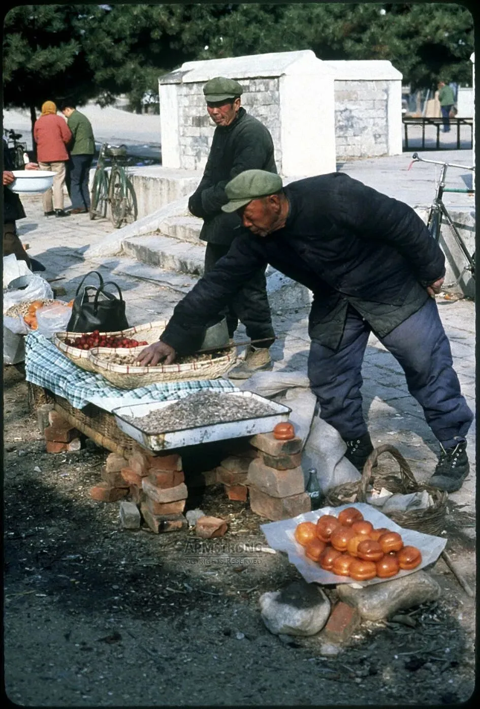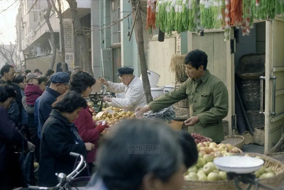 然后下一个是过年买水果的场景。平常一年里,很少会这么大批量地买水果,只有到过年的时候,才会好好犒劳一家人,迎接新的一年。照片里的水果摊前挤满了人,都在挑苹果、橘子,冬天橘子特别多。