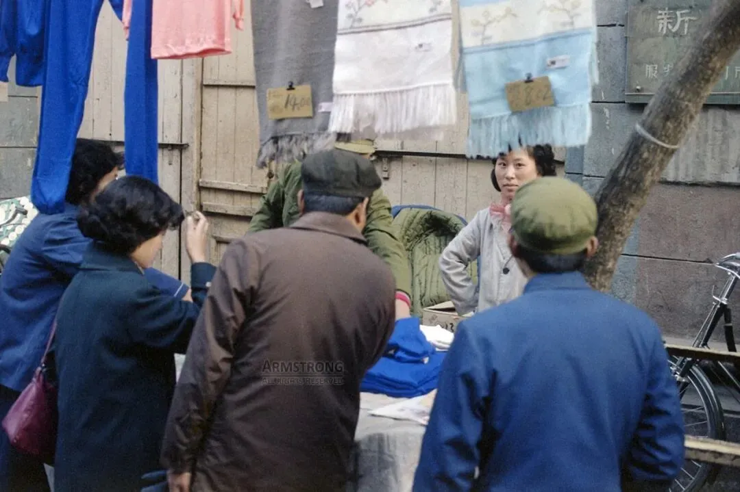 这个是卖头巾的摊位。那时候过年,女性特别流行戴头巾,最开始是方块头巾。过年的时候,大家都会去理发店烫一个时兴的卷发,再买一块喜欢的头巾,蓝色、黄色、红色,什么颜色都有。