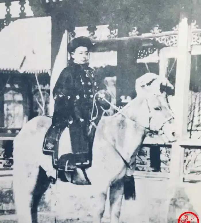 图中这位骑在马上的是载振,身形还没长开,脸蛋圆圆的,帽檐压得低低的,身上缀满铜扣的呢子袍子在镜头里发亮,缰绳攥在手里,马鞍边缘绣着暗纹,规矩全在细节里,他出身满洲正黄旗,13岁就获头品顶戴,这马照多半是给宗室看的体面物件,老辈人常说,小小年纪骑得稳,不全是本事,更多是身份在托着你走。