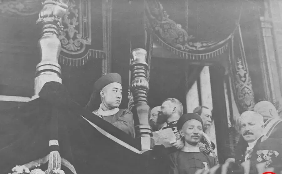 这张台阶上的合影最有戏,载振侧着脸,眼神往台下扫,身后是华丽的柱头和垂穗的幕布,一圈洋人军官肩章胸花叠成一片,他就是那次奉命去参加英国爱德华七世加冕典礼的专使,转道法比美日一路看过去,第一次在国际场合高调亮相,奶奶看照片时笑我,别看他站得挺,心里准打鼓呢。